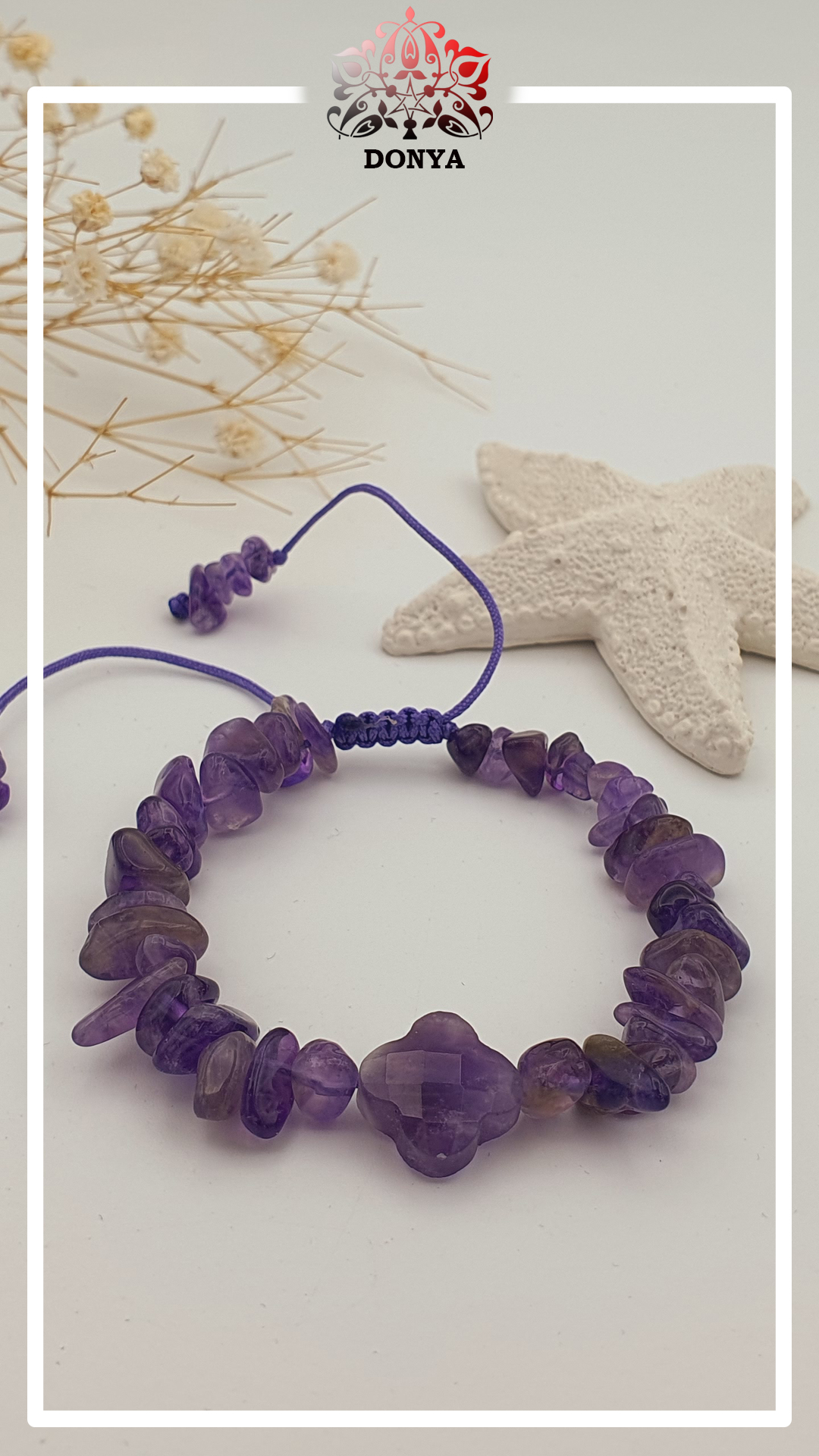 دستبند سنگ امیتیسیت چیپسی همراه با پلاک چهار پر ونکلیف تراش دار آمیتیسیت با کیفیت بسیار بالا
