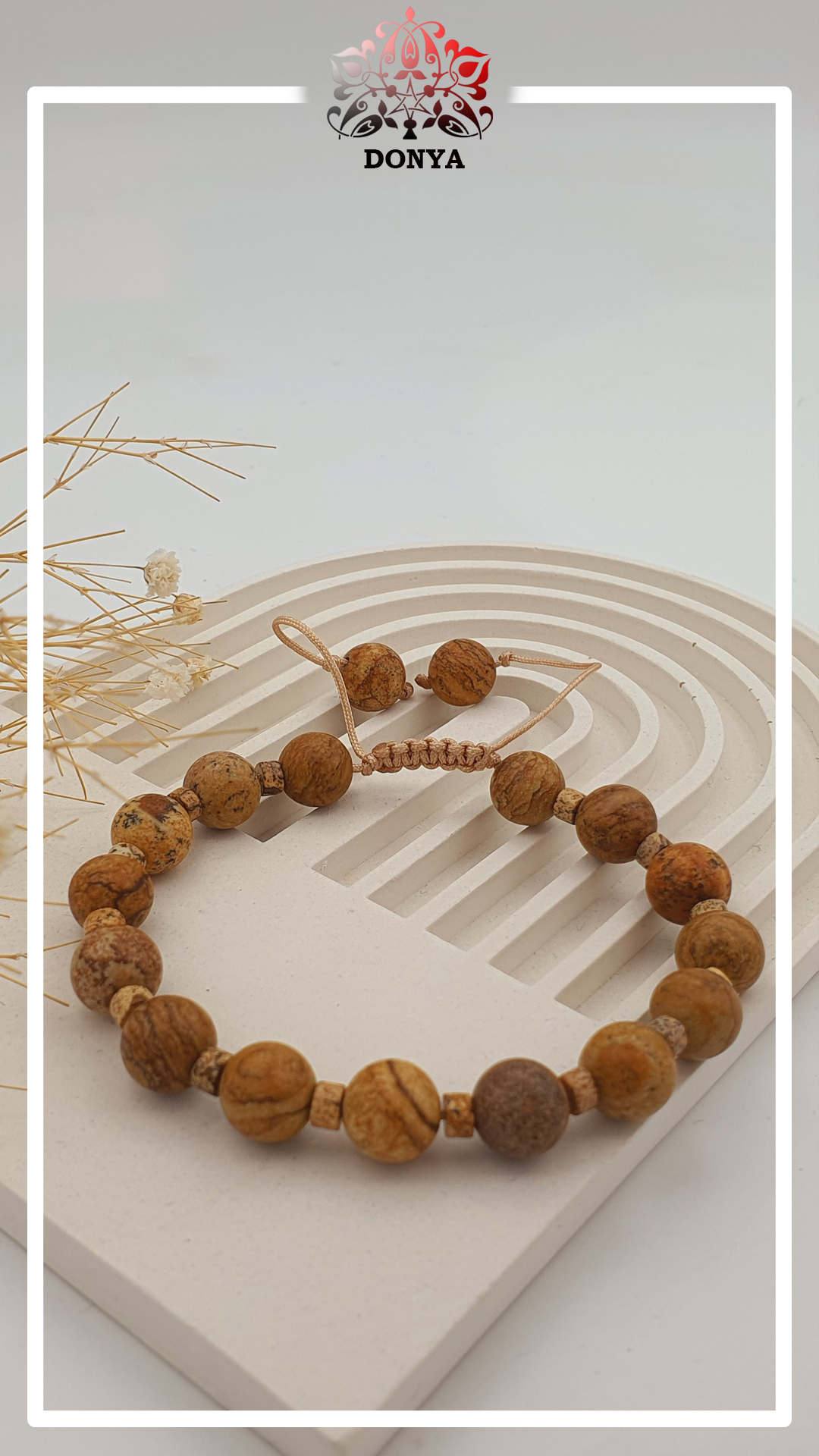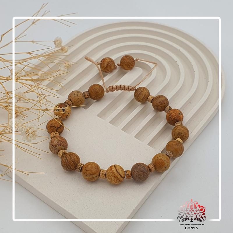 دستبند سنگ جاسپر خاکی با کیفیت بسیار بالا تشکیل شده از پلاک جاسپر خاکی گرد، جاسپر خاکی سایز ۸ و بافت کشویی قابل تنظیم مناسب آقایان و خانم ها فروردین ماهی